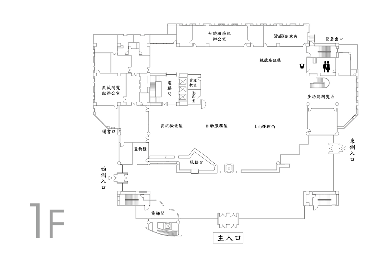 | 一樓 | 主入口、聯合櫃台、存物室、資訊檢索區、展示區、典藏閱覽組、知識服務組 |