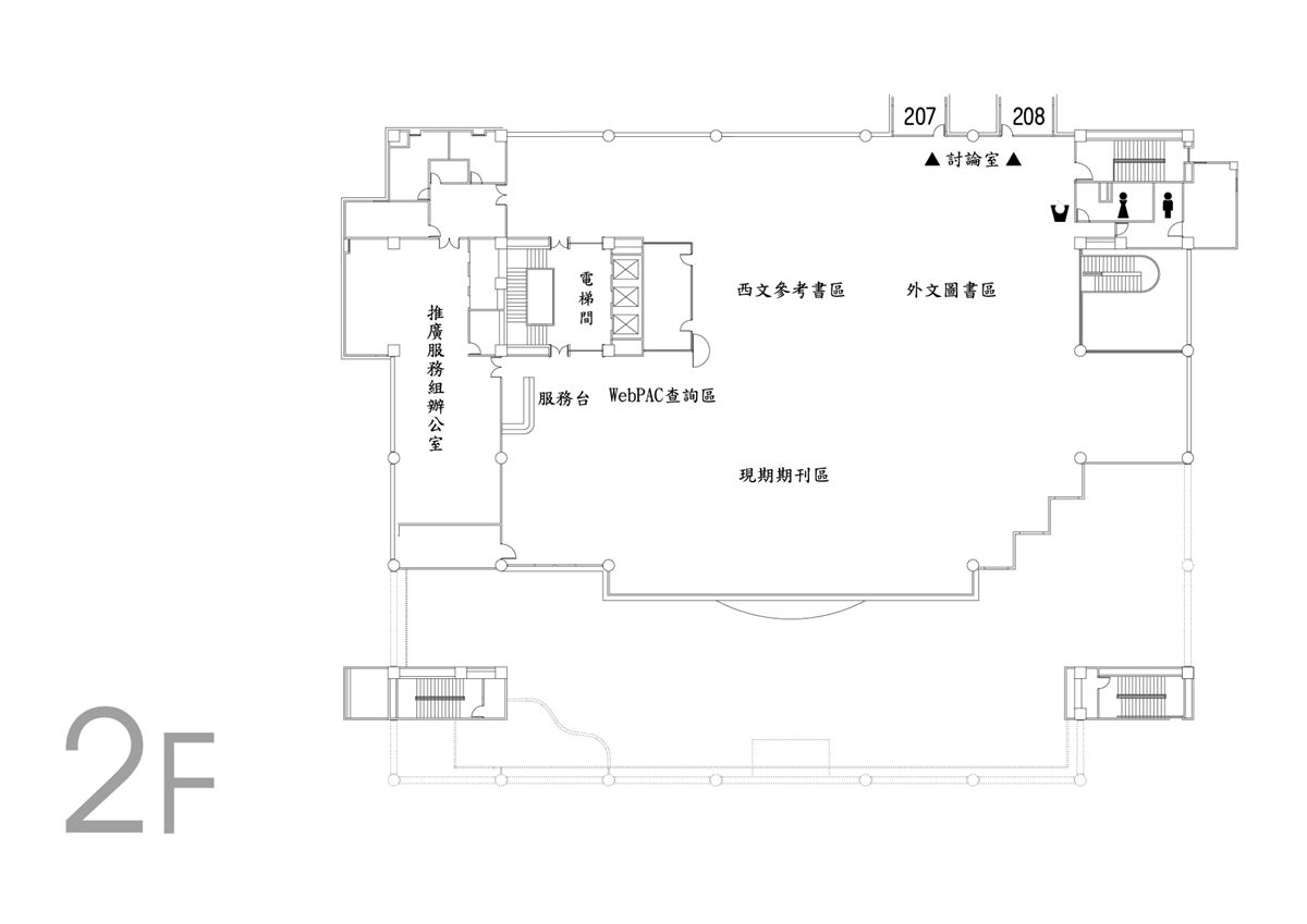 | 二樓 | 中文現期期刊區、外文現期期刊區、期刊工具書區、西文參考書、討論室、推廣服務組 |