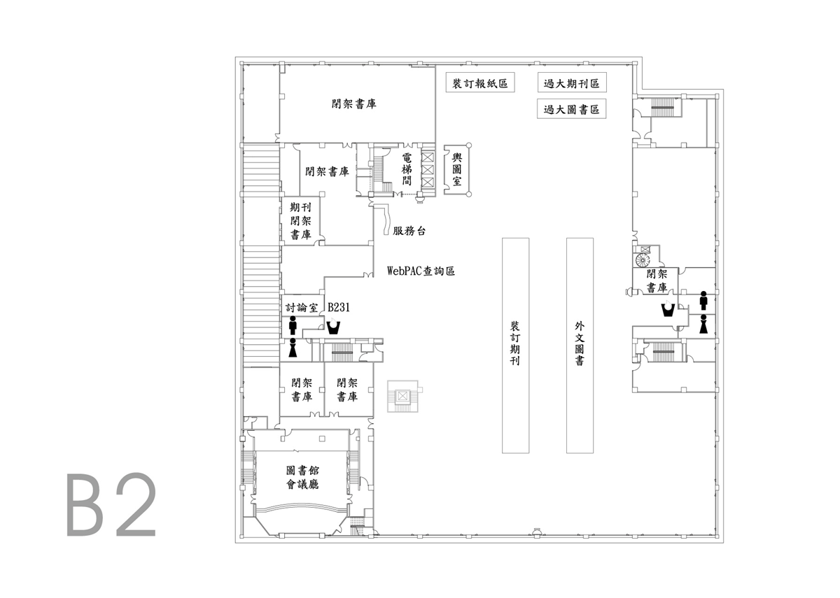 | 地下二樓 | 裝訂期刊區、報紙合訂本區、過大圖書區、過大期刊區、外文圖書區、討論室、化學摘要區 |