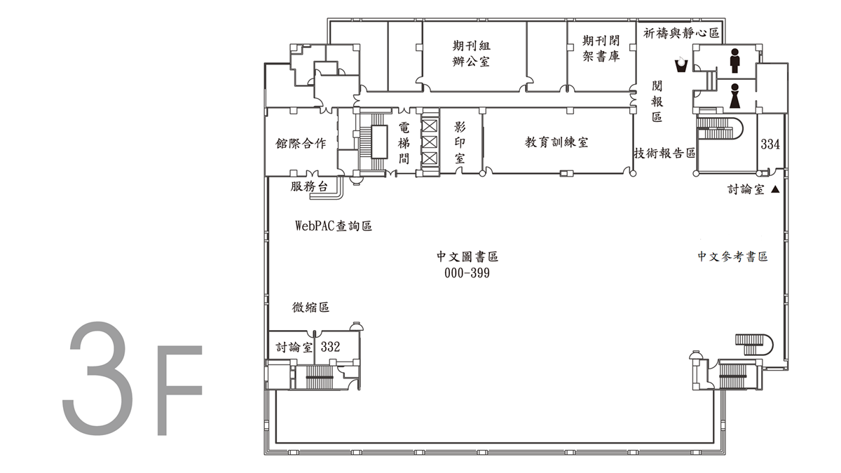 | 三樓 | 中文圖書(分類號000-399)、館際合作、微縮資料區、技術報告區、閱報區、教育訓練室、中文參考書、討論室、期刊組 |