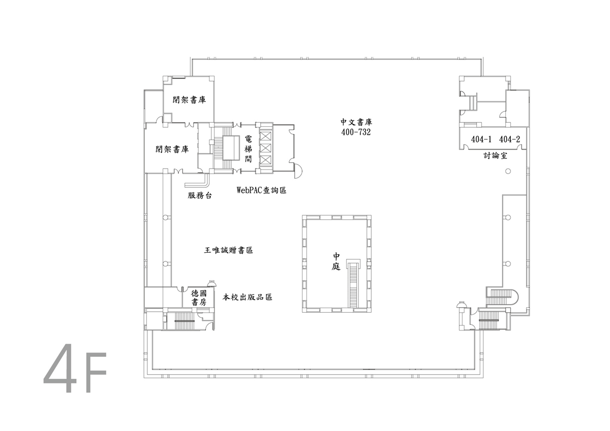 | 四樓 | 中文圖書(分類號400-732)、本校出版品專區、王唯誠贈書區、討論室、典藏閱覽組 |