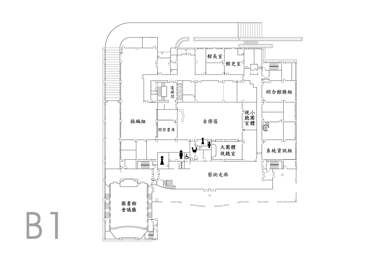 | 地下一樓 | 圖書館會議廳、藝術走廊、採編組、館長室、綜合館務組、系統資訊組 |