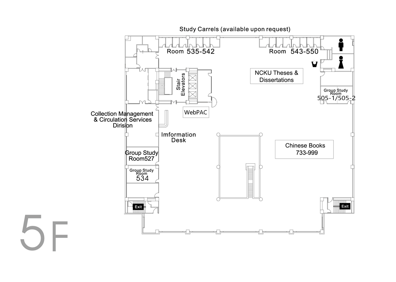 | 5F | Chinese Books (733-999), NCKU Theses & Dissertations, Music Appreciation Area, Group Study Rooms, Study Carrels, Collection Management and Circulation Services Division |