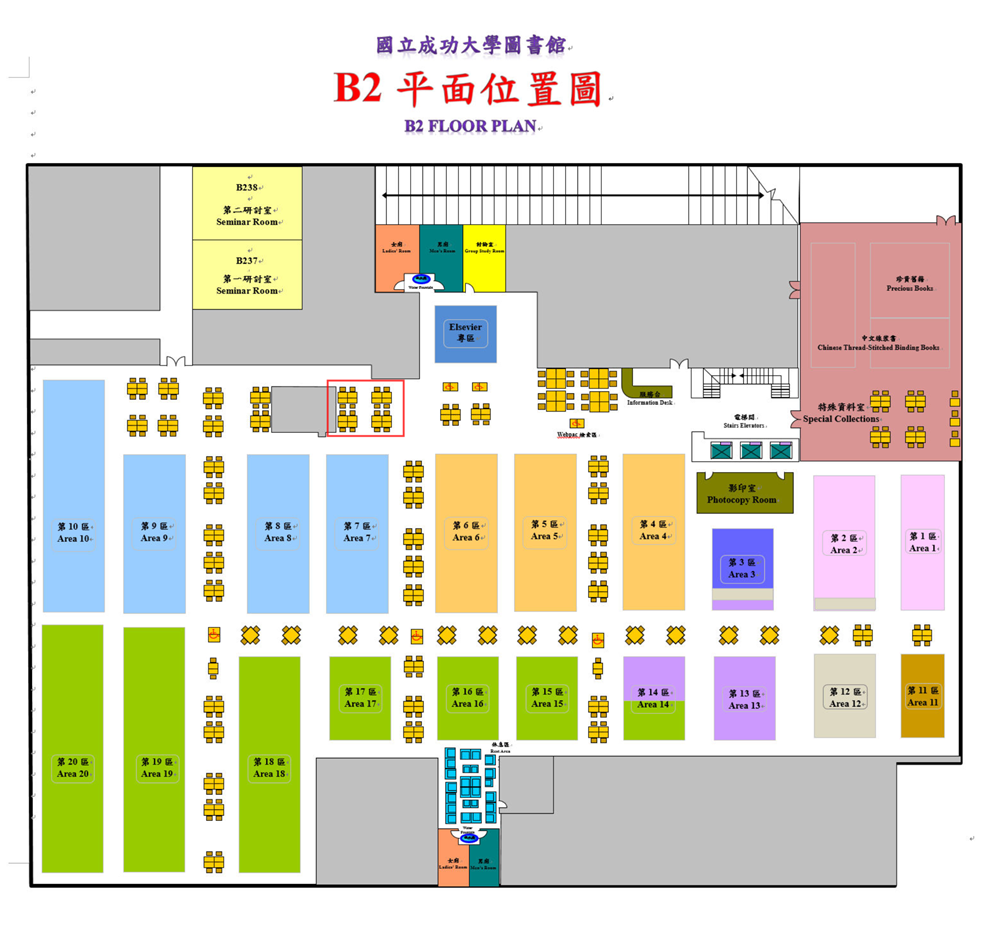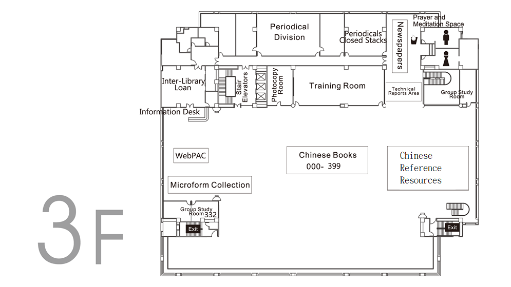 | 3F | Chinese Books (000-399), Inter-Library Loan Service, Microform Collection, Technical Reports, Current Newspapers, Training Room, Group Study Rooms, Periodicals Division(Foreign Language Periodicals) |
