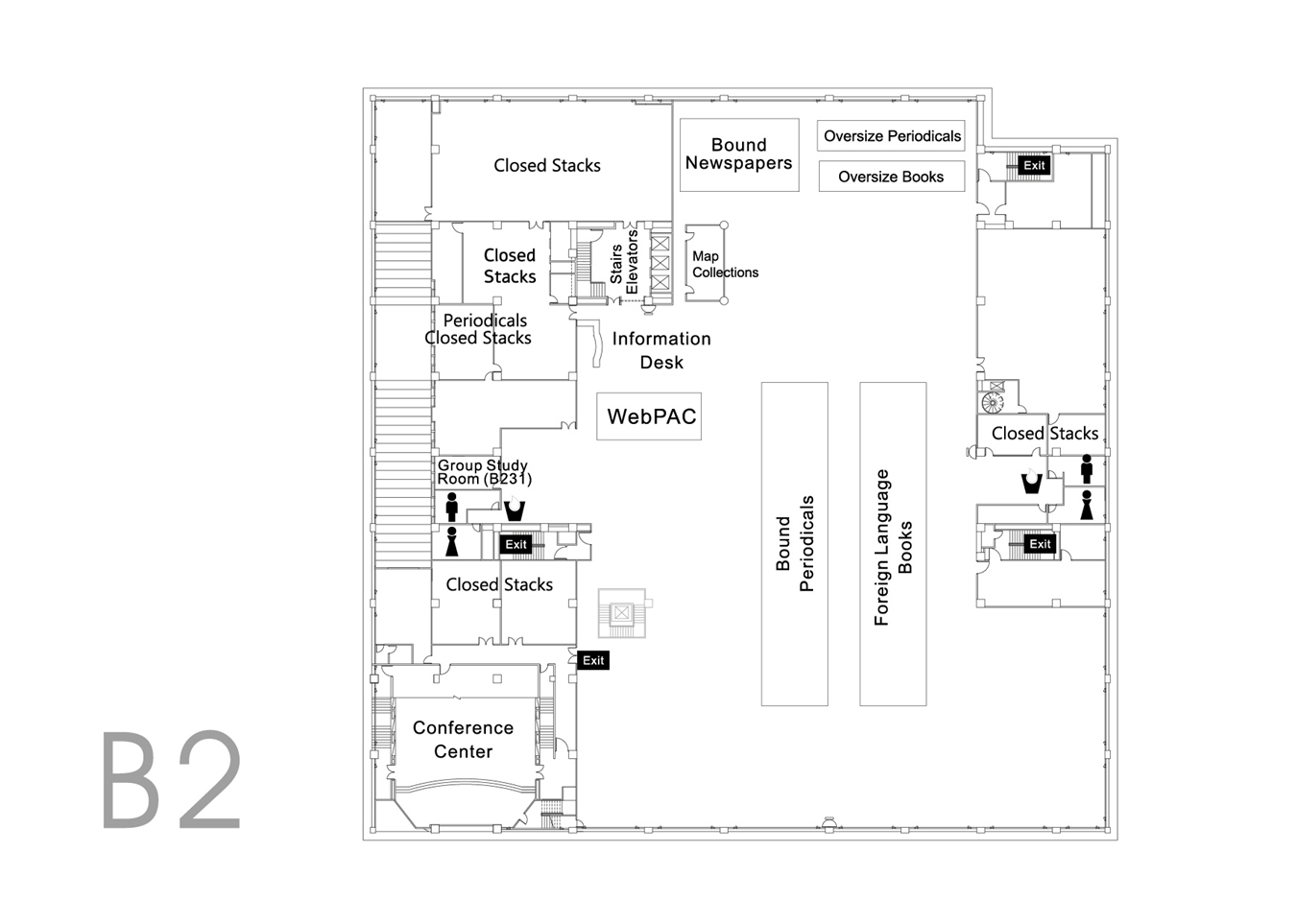 | B2 | Foreign Language Books, Bound Periodicals, Bound Newspapers, Oversize Books, Oversize Bound Periodicals, Special Collections, Precious Books, Seminar Rooms, Group Study Rooms, Chemical Abstracts |
