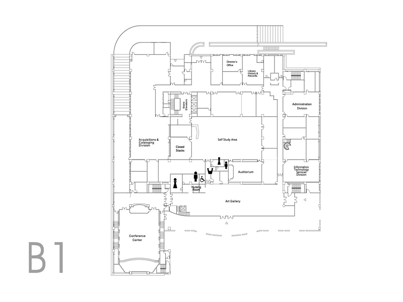 | B1 | Media Center, Library Conference Center, Art Gallery, Library Extension Services Division, Acquisition and Catalog Division, Director's Office, Information Technology Services Division |
