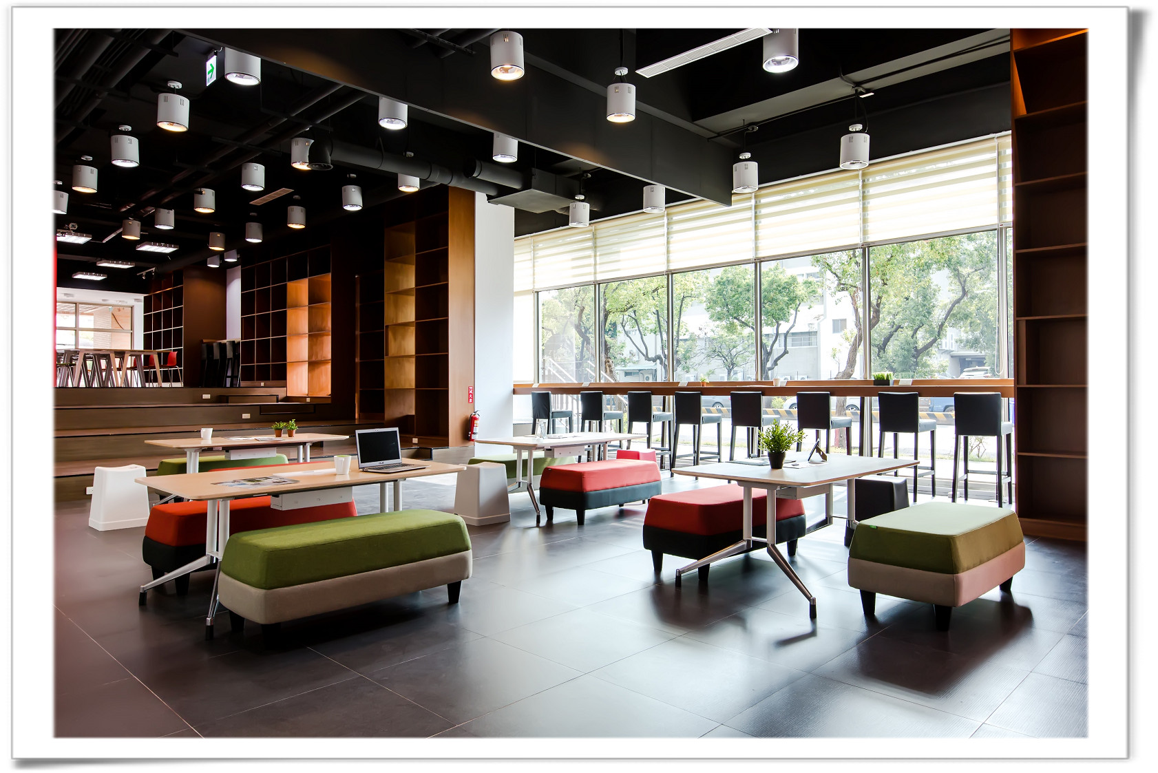 - The rest area is next to the quiet reading room, the public facilities such as toilets and drinking fountains are located here. In addition, round bar height tables, high chairs and colorful movable stools are provided for taking a break.
