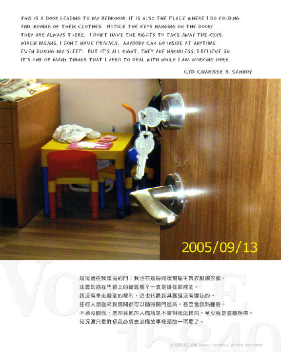 「凝視驛鄉」攝影展,共展示27幅作品,選自台灣國際勞工協會 (TIWA) 於2005年及2006年開辦的兩期「移工攝影工作坊」學員作品,主要以來自東南亞國家移工朋友,記錄她們在工作和生活裡的各種心情,以及對台灣這塊土地的觀察與感受。 從一張張攤在桌上的電話卡、一支插在門上的鑰匙、一個常見的三寶飯餐盒、一支擺在角落的掃把、一個掛在牆上的時鐘…透過簡單平凡的影像,真實反映移工身處驛鄉的心情感受,也映照著台灣社會面對這群移工的方式與態度。
